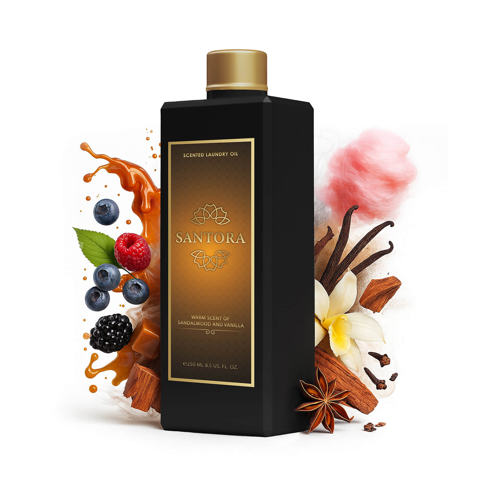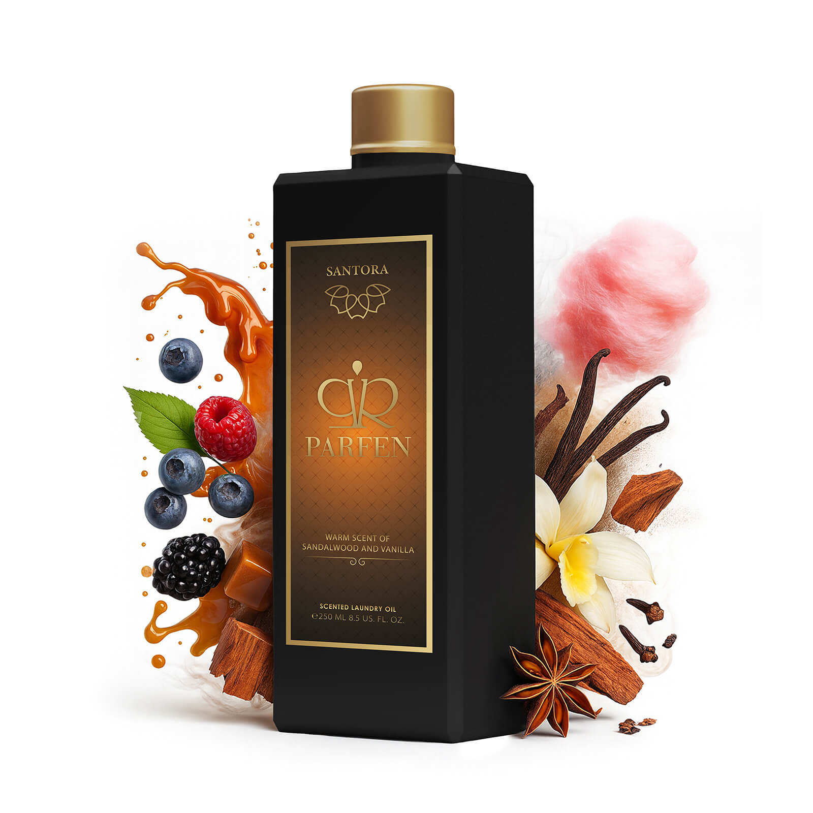SANTORA je zapeljiv parfum za perilo. Po pranju pusti na tkaninah sladek gurmanski vonj, zmehčan z balzamičnimi toni sandalovine. Vaša oblačila ali posteljnina so oviti v tople note. Še dolgo po pranju boste čutili sladko in nežno orientalsko aromo.